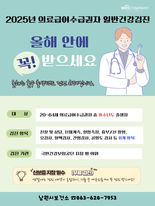 ¿ÃÇØ ÀÇ·á±Þ¿©¼ö±Þ±ÇÀÚ ÀϹݰǰ°ËÁø ´ë»óÀÚ´Â 20~64¼¼±îÁö Ȧ¼ö³âµµ Ãâ»ýÀÚ·Î, ¿¬¸»±îÁö ¹«·á °ËÁø ÇýÅÃÀ» ³õÄ¡Áö ¾Êµµ·Ï Á¶¼ÓÈ÷ ¼ö°ËÇÒ °ÍÀ» ´çºÎ¹Þ°í ÀÖ´Ù.