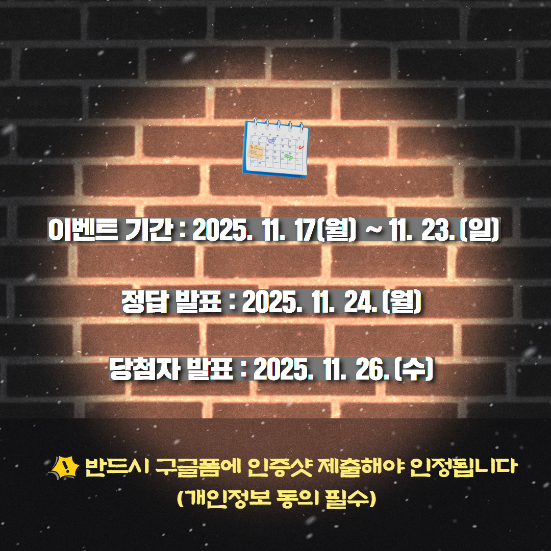 정답자 가운데 30명을 전산으로 무작위 추첨해 치킨 기프티콘을 제공할 예정이며, 당첨자 발표는 11월 26일 두 공식 채널을 통해 공개한다.