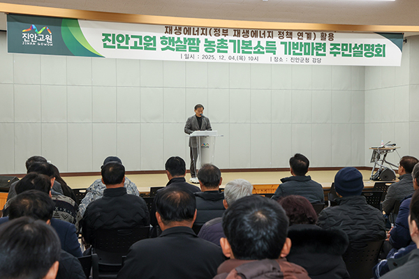 [진안=뉴전북] 진안군(군수 전춘성)은 4일 군청 강당에서 지방 소멸과 기후변화 위기에 대응하고 지속 가능한 지역 활력을 창출하기 위해 재생에너지를 활용한 “진안고원 햇살팜 농촌기본소득 프로젝트” 주민설명회를 개최했다.