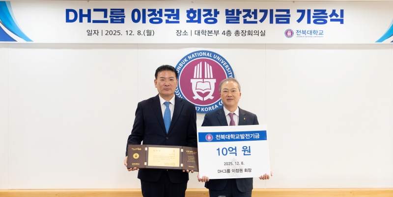 [교육=뉴전북] 전북대학교는 DH그룹 이정권 회장이 지역 인재 양성을 위해 발전기금 10억 원을 기부하고, 매년 1억 원 규모의 장학금을 지원하기로 했다고 8일 밝혔다.
