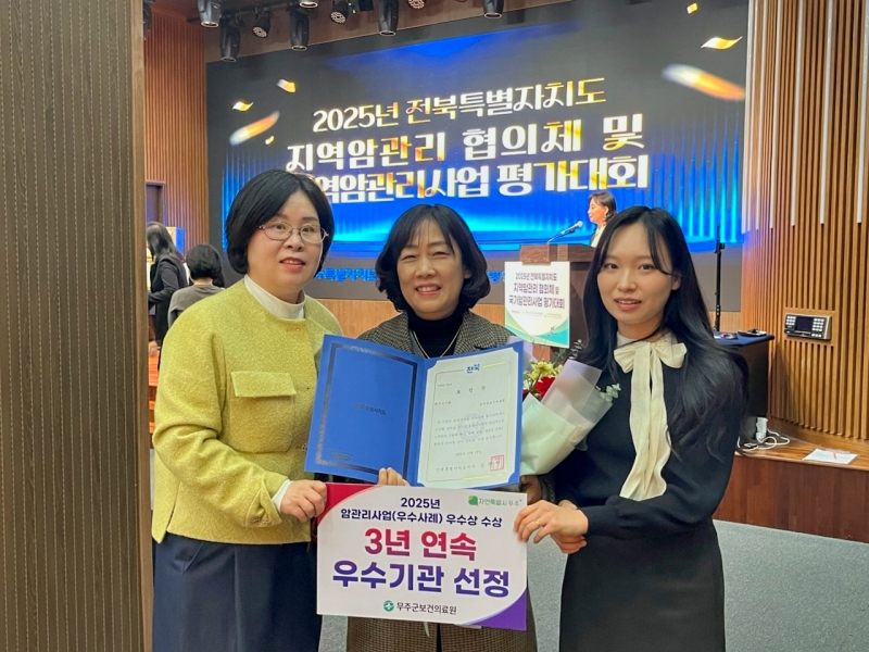[¹«ÁÖ=´ºÀüºÏ] ¹«ÁÖ±ºº¸°ÇÀÇ·á¿øÀÌ ÀüºÏƯº°ÀÚÄ¡µµ¿Í ÀüºÏ´ëº´¿ø Áö¿ª¾Ï¼¾ÅͰ¡ ÁÖ°üÇÏ´Â ±¹°¡¾Ï°ËÁø ºÐ¾ß¿¡¼ 3³â ¿¬¼Ó ¿ì¼ö±â°üÀ¸·Î ÀÎÁ¤¹Þ¾Ò´Ù.