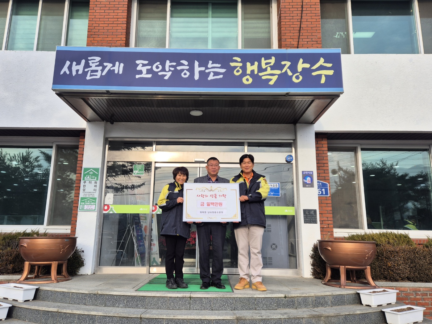 [장수=뉴전북] 장수군 계북면 남녀의용소방대(대장 이진성·송영자)가 지역 내 어려운 이웃을 지원해 달라며 성금 100만원을 계북면사무소에 기탁했다고 12일 밝혔다.
