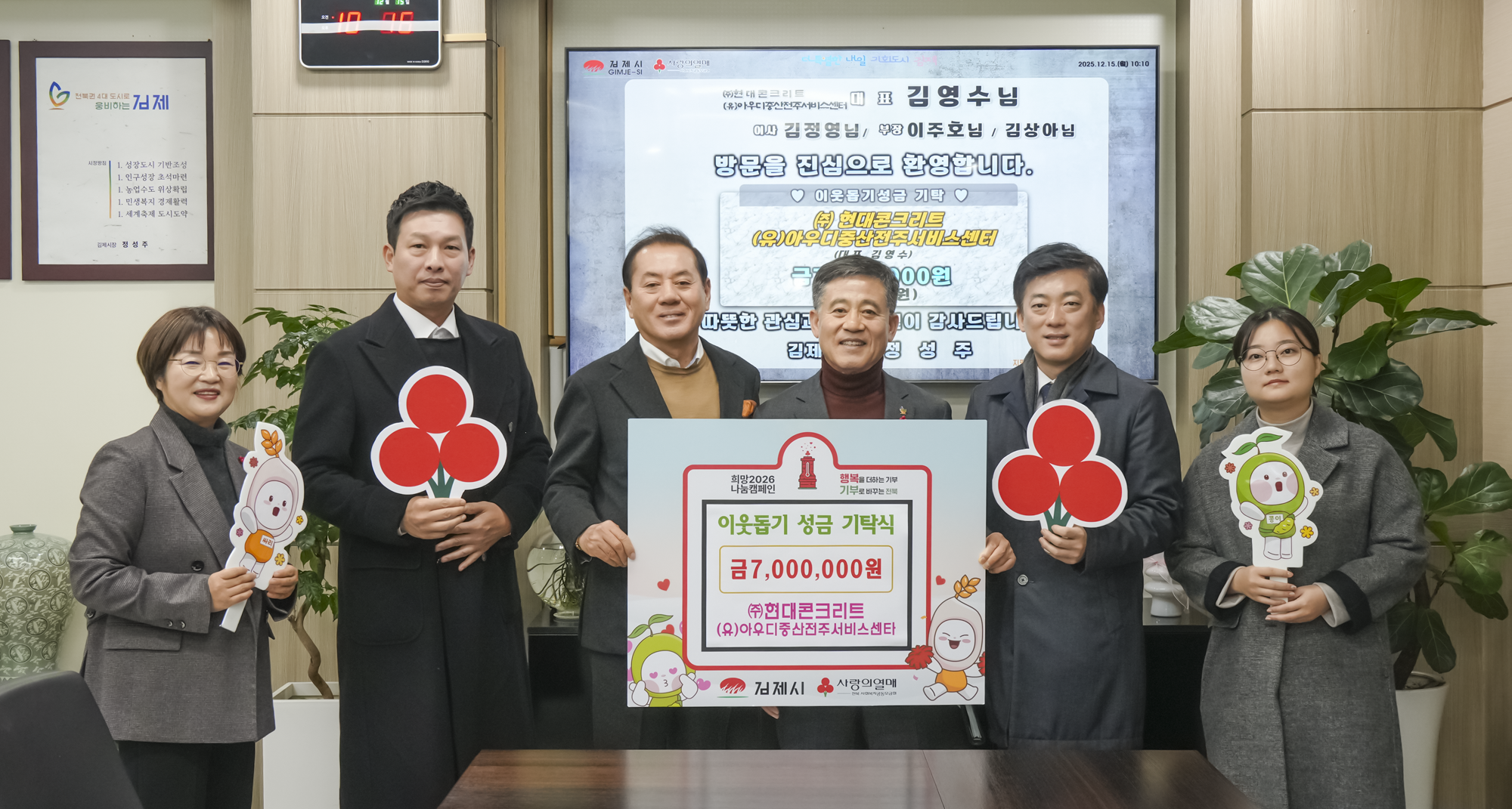 [김제=뉴전북]김제시(시장 정성주)는 (주)현대콘크리트(대표 김영수), (유)아우디중산전주서비스센터(대표 김영수)가 지난 15일 지역의 어려운 이웃을 돕기 위해 성금 700만 원을 기탁했다고 밝혔다.