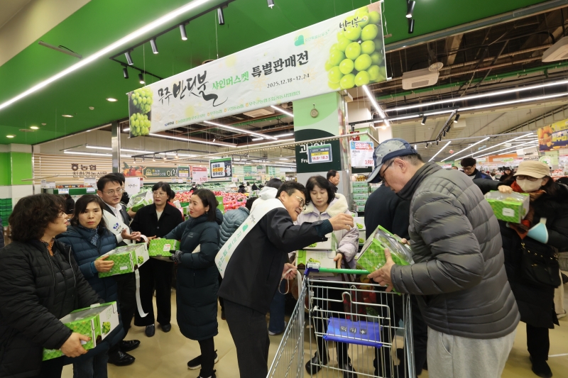 19일에는 황인홍 무주군수와 이동근 농협유통 대표이사, 최영섭 양재지사장을 비롯한 무주군과 농협유통 관계자 등 20여 명이 함께 현장에서 무주 반딧불 샤인머스캣의 우수성을 알리며 소비 촉진에 나서 의미를 더했다.