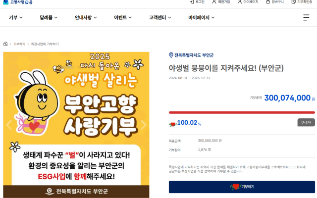 [°æÁ¦=´ºÀüºÏ] ºÎ¾È±ºÀÌ °íÇâ»ç¶û±âºÎÁ¦ ÁöÁ¤±âºÎ ESG »ç¾÷À¸·Î ÃßÁøÇÑ ¡®¾ß»ý¹ú ºØºØÀ̸¦ ÁöÄÑÁÖ¼¼¿ä!¡¯ ÇÁ·ÎÁ§Æ®°¡ ¸ñÇ¥ ¸ð±Ý¾× 3¾ï¿øÀ» ´Þ¼ºÇß´Ù.