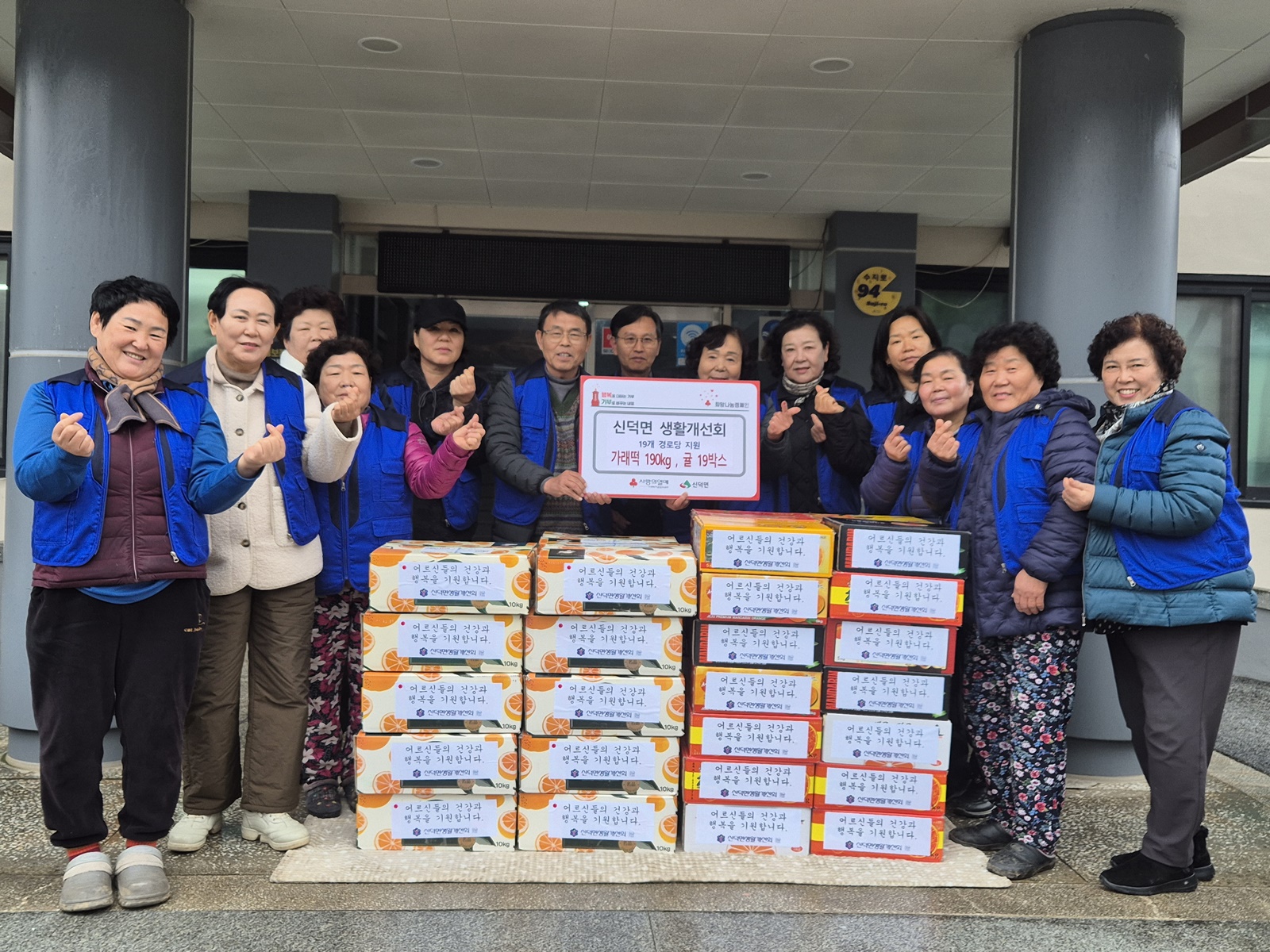 이날 면내 경로당 19개소에 가래떡 190kg, 귤 19박스(180만 원 상당)를 지원하기 위해 회원들이 신덕면사무소에 모여, 각 마을 경로당까지 직접 방문해 어르신들을 위한 따뜻한 마음까지 나눠 훈훈한 감동을 전했다.