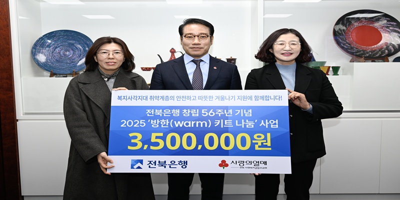 전상익 전북은행 부행장은 “지역사회의 한 구성원으로서 어려운 이웃과 따뜻한 마음을 나누고자 이번 기부를 마련했다”라며 “앞으로도 지역사회 발전과 소외계층 지원에 앞장서며 나눔의 가치를 실천하겠다”라고 말했다.