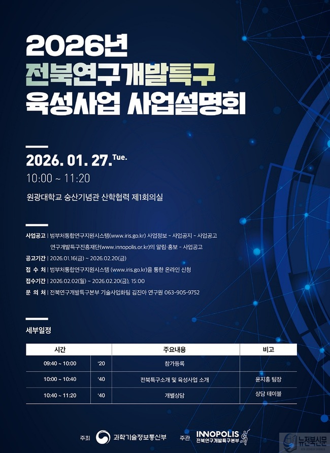 익산시는 오는 27일 원광대학교 숭산기념관에서 특구 내 기업, 대학, 연구기관을 대상으로 '2026 연구개발특구 육성사업 설명회'를 개최한다고 23일 밝혔다.