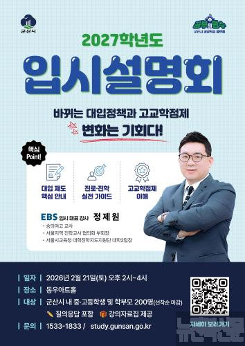 [교육=뉴전북] 군산시가 변화하는 대입 정책과 고교학점제에 대한 학생·학부모의 이해를 돕기 위해 21일 오후 2시 동우아트홀에서 ‘2027학년도 입시설명회’를 개최한다.