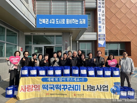 [김제=뉴전북]김제시 교월동 행정복지센터는 지역사회보장협의체(민간위원장 조종옥)가 지난 12일 설 명절을 앞두고 저소득 취약계층 70세대를 대상으로 “떡국떡 꾸러미 나눔 사업”을 실시했다고 밝혔다.