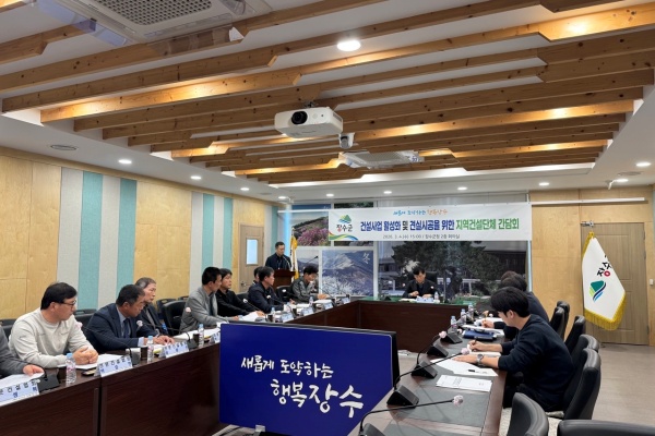 장수군이 군청에서 장수군전문건설협회(회장 이대운)와 간담회를 개최했다. 간담회 목적은 농·축산업 중심의 지역 경제 구조 속에서 건설업의 역할 재조명과 지역 업체의 안정적 성장 기반 형성이다.
