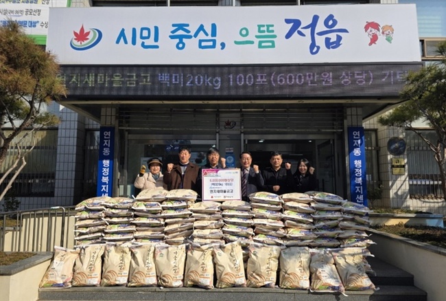 [정읍=뉴전북] 정읍연지새마을금고(이사장 유연천)는 10일 어려운 이웃에게 전달해 달라며 백미 20kg 100포(600만원 상당)를 연지동 행정복지센터에 기탁했다.