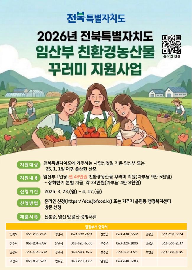 [도정=뉴전북] 전북특별자치도가 임산부의 건강 증진과 친환경 농산물 소비 확대를 위해‘임산부 친환경농산물 꾸러미 지원사업’신청을 오는 3월 23일부터 4월 17일까지 모집한다고 19일 밝혔다.