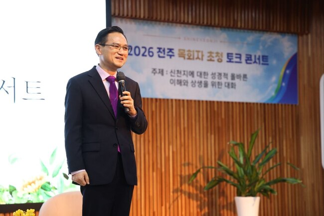 지난 21일 전주 하늘문화센터에서 ‘2026 목회자 초청 토크 콘서트’ 이용우 지파장 강연모습.특히 이번 행사는 일방적 강연 대신 벗어나 사전 질문지를 활용한 실시간 질의응답 방식으로 진행돼 신천지예수교회에 대한 목회자들의 궁금증을 직접 해소하는 시간을 가졌다.