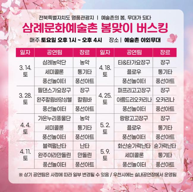 공연 관련 상세 일정 및 문의는 삼례문화예술촌(063-290-3869)으로 하면 된다.