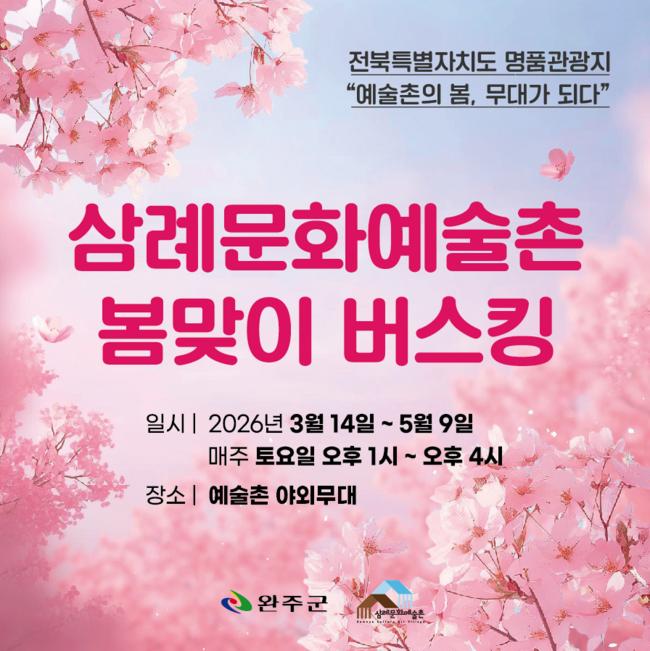 [문화=뉴전북] 완주군 삼례문화예술촌이 오는 5월 9일까지 매주 토요일마다 ‘2026년 명품관광지 봄맞이 버스킹’을 개최하며 관광객들에게 봄의 설렘을 선사한다.