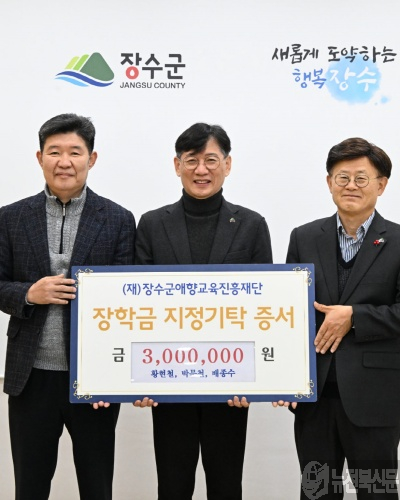 [교육=뉴전북] 장수농업협동조합과 소속 단체들이 지역 교육 발전, 인재 양성을 위해 (재)장수군애향교육진흥재단에 장학금 300만원을 기탁했다. 이번 장학금은 장수농업협동조합(조합장 김용준), 전국협동조합업종본부, 장수농협지회(지회장 장현우), 장수농협 고향주부모임(회장 정은숙)이 지역 학생들의 밝은 미래를 응원하고자 마련했다...