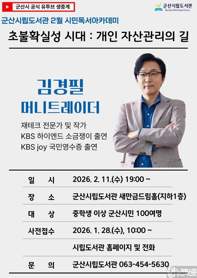 [문화=뉴전북] ‘돈쭐남(돈으로 혼쭐내는 남자)’으로 큰 인기를 얻고 있는 김경필 머니트레이너 특별 강연이 군산시립도선관에서 오는 11일 저녁 7시에 열린다. 강연은 ‘초불확실성의 시대: 개인 자산 관리의 길’을 주제로 펼쳐진다. 이번 강연은 지역사회의 정보 거점으로서 시민의 삶을 바꾸는 실용적 인문학을 선사하는 시...