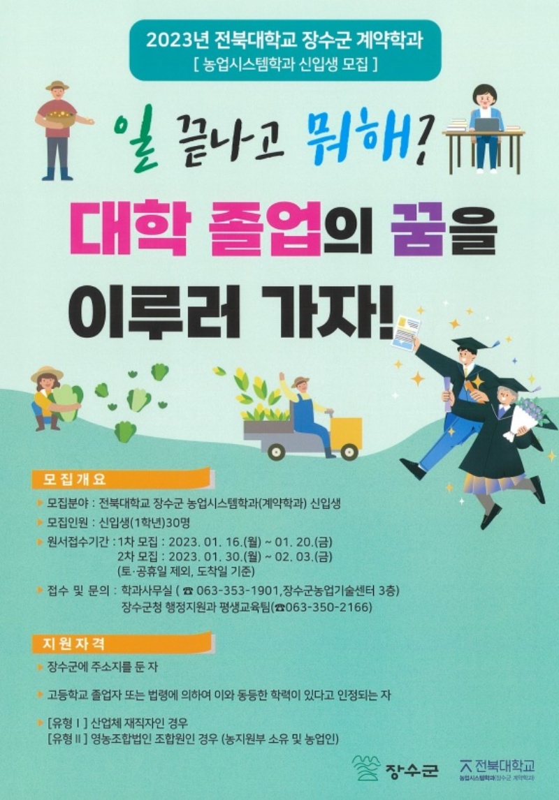 [장수=뉴전북]장수군이 ‘전북대학교 장수군 농업 시스템학과’ 신입생을 오는 16일부터 20일까지, 30일부터 다음 달 3일까지 2차에 걸쳐 모집한다.