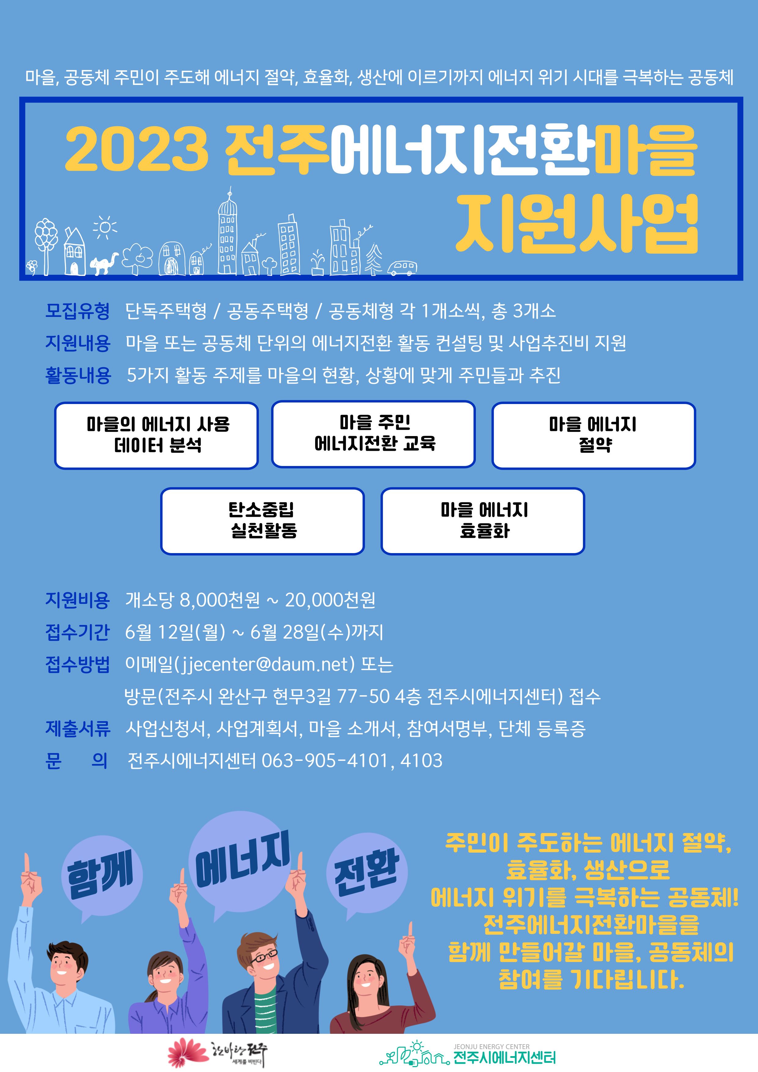 전주시에너지센터(이하 센터)는 기후 위기에 대응하기 위해 마을 구성원들이 에너지전환에 대한 이해를 바탕으로 에너지절약과 생산 등을 기획하고 실천하는 주민 주도의 에너지전환 공동체인 ‘전주에너지전환마을’ 신청을 오는 23일까지 접수한다.