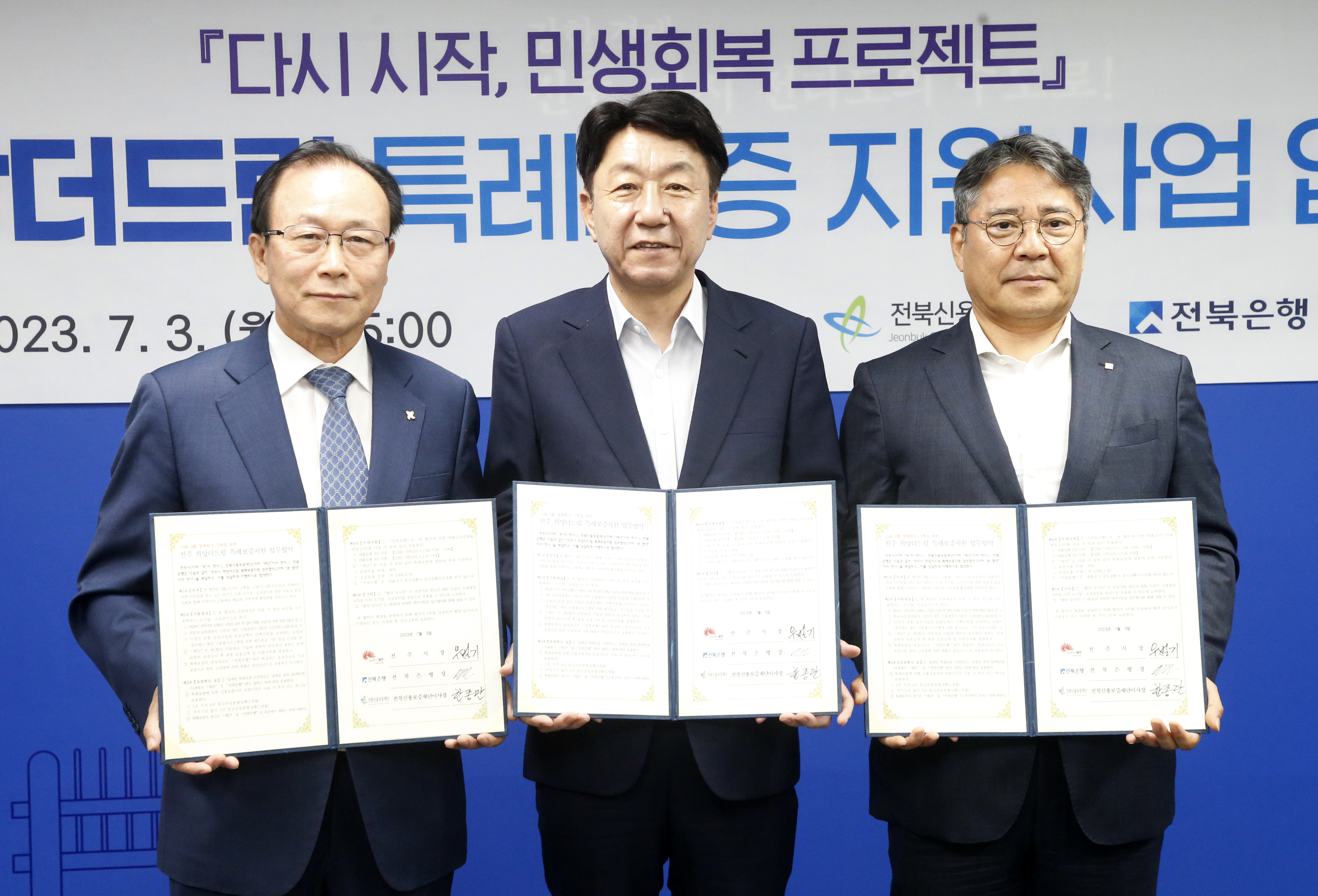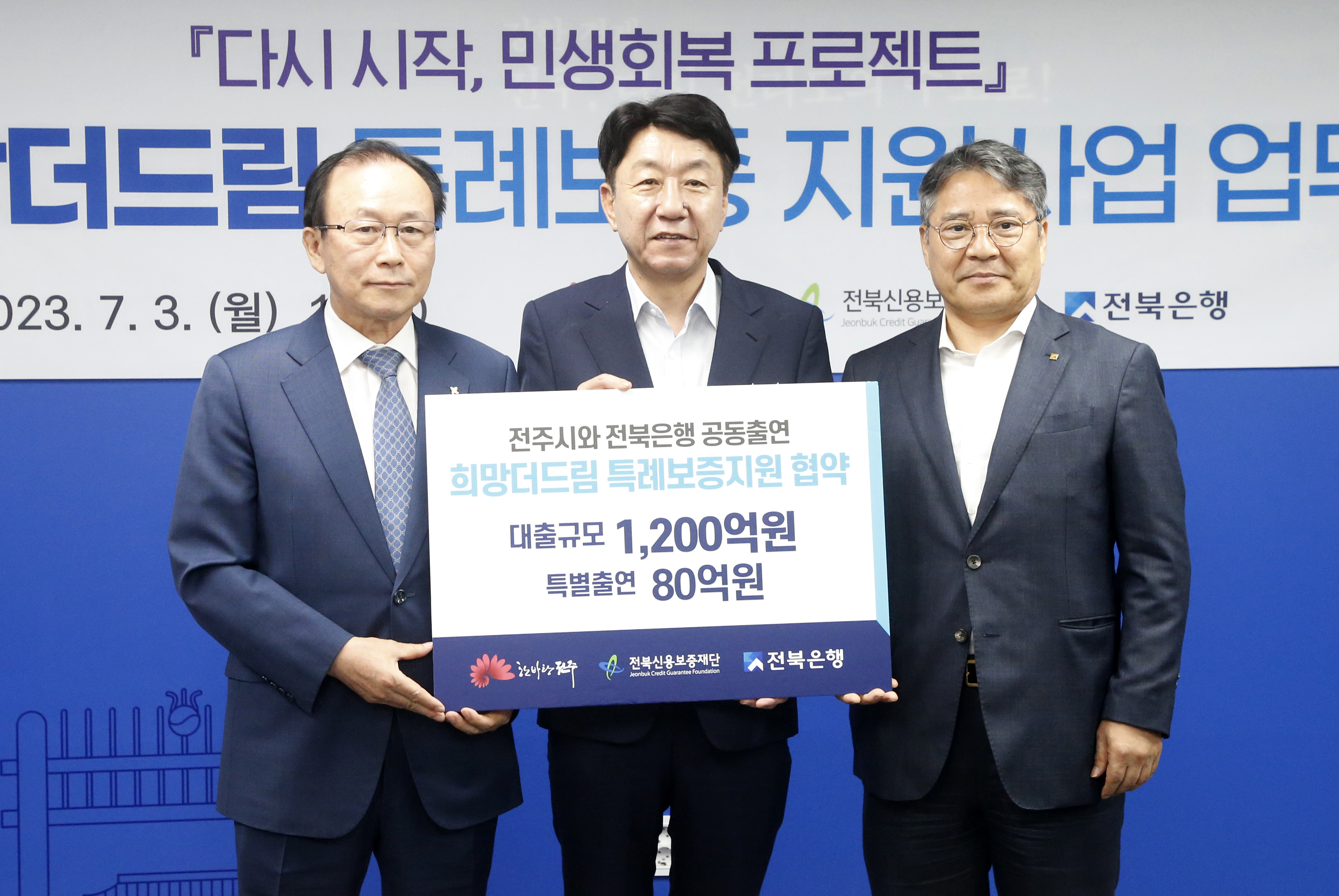 - - 전주시, 3일 전북신용보증재단·전북은행과 ‘전주 희망 더드림 특례보증 지원사업’ 협약 체결 - 재원 80억 원 활용해 총 1200억 원 규모의 대출 실행, 3년간 3% 이자도 지원키로