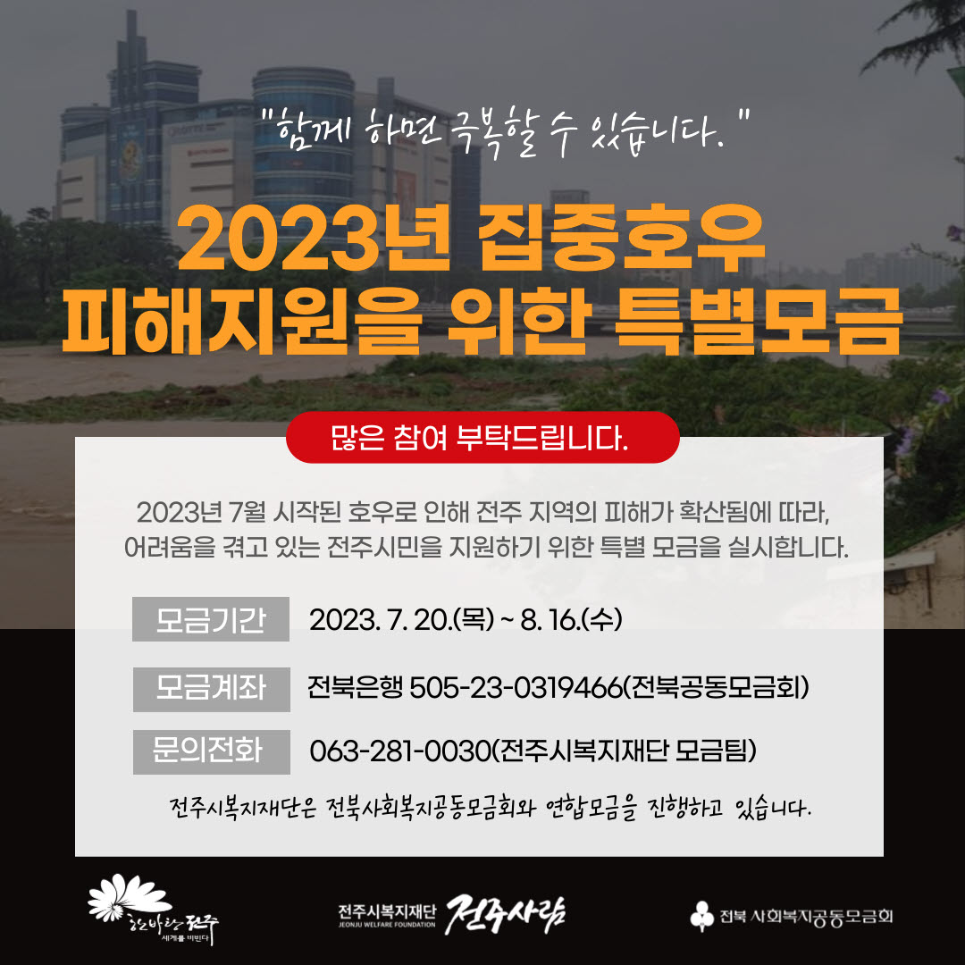 전주시복지재단은 오는 8월 16일까지 집중호우 피해 지원을 위한 특별모금을 진행한다고 21일 밝혔다.