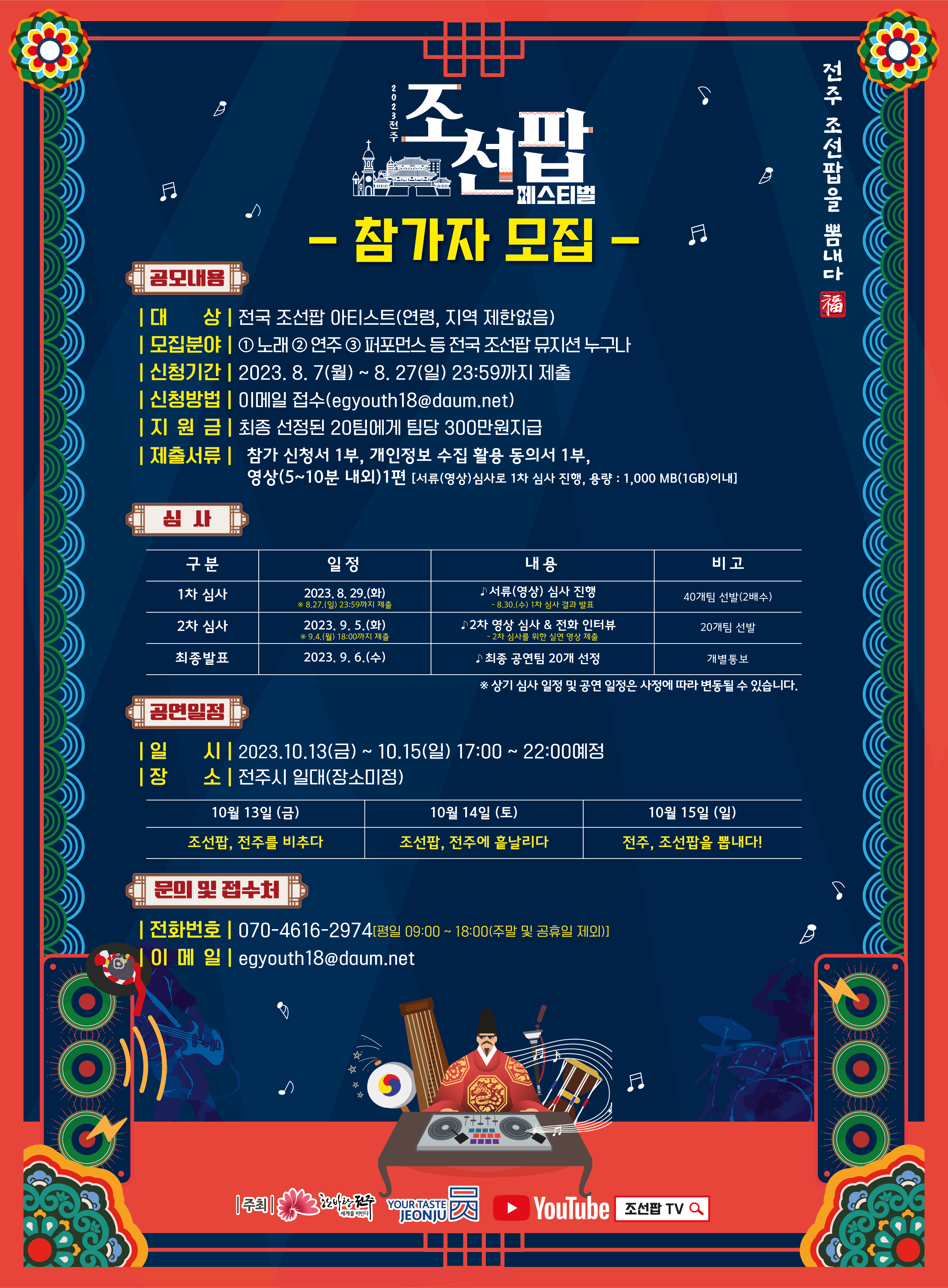 참가를 원하는 조선팝 예술가는 전주시 누리집 새소식에서 신청서를 내려받은 뒤 메일(egyouth18@daum.net)로 신청하면 된다. 기타 자세한 사항은 전주 조선팝 페스티벌 추진 사무국(070-4616-2974)으로 문의하면 된다.