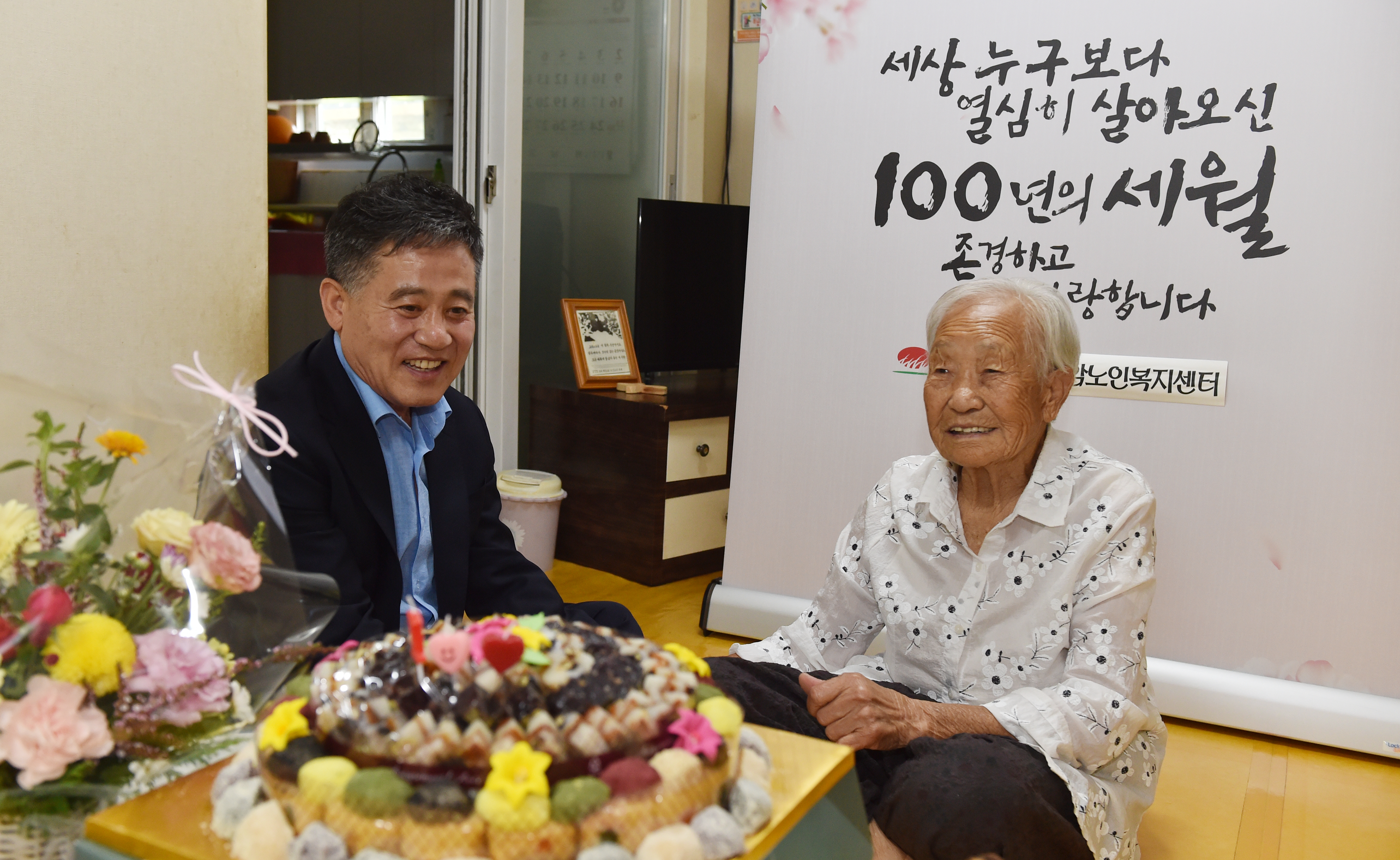 정성주 김제시장은 28일 봉남면에 거주하는 103세 A 어르신댁을 방문해 발마사지기와 내의 등 장수 축하물품을 전달하고 존경과 감사의 뜻을 전했다.