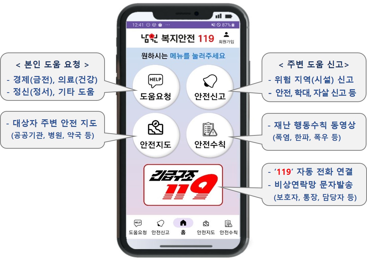 「남원 복지안전 119」 앱은 긴급구조 119, 도움 요청, 안전 신고, 안전 지도, 안전 수칙 등 5가지 주요 기능을 탑재하여, 시민들이 언제 어디서나 시간과 장소에 구애받지 않고 도움을 요청하거나 신고할 수 있는 기능을 지원한다.