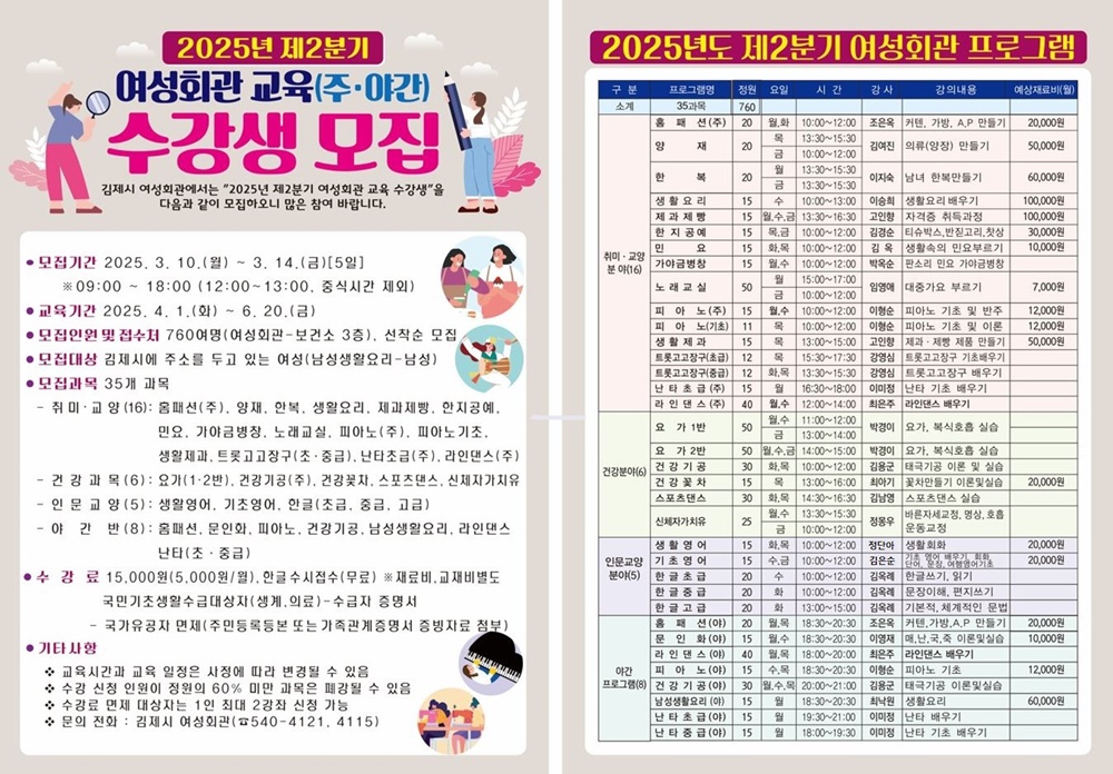 김제시에 주소를 둔 여성은 누구나 신청 가능하며 방문 접수를 통해 선착순으로 모집하고 수강료는 3개월에 15,000원으로 국민기초생활수급자(생계.의료), 국가유공자 등은 수강료가 면제된다. 이번에 모집된 수강생은 오는 4월 1일부터 3개월간 교육이 진행된다.