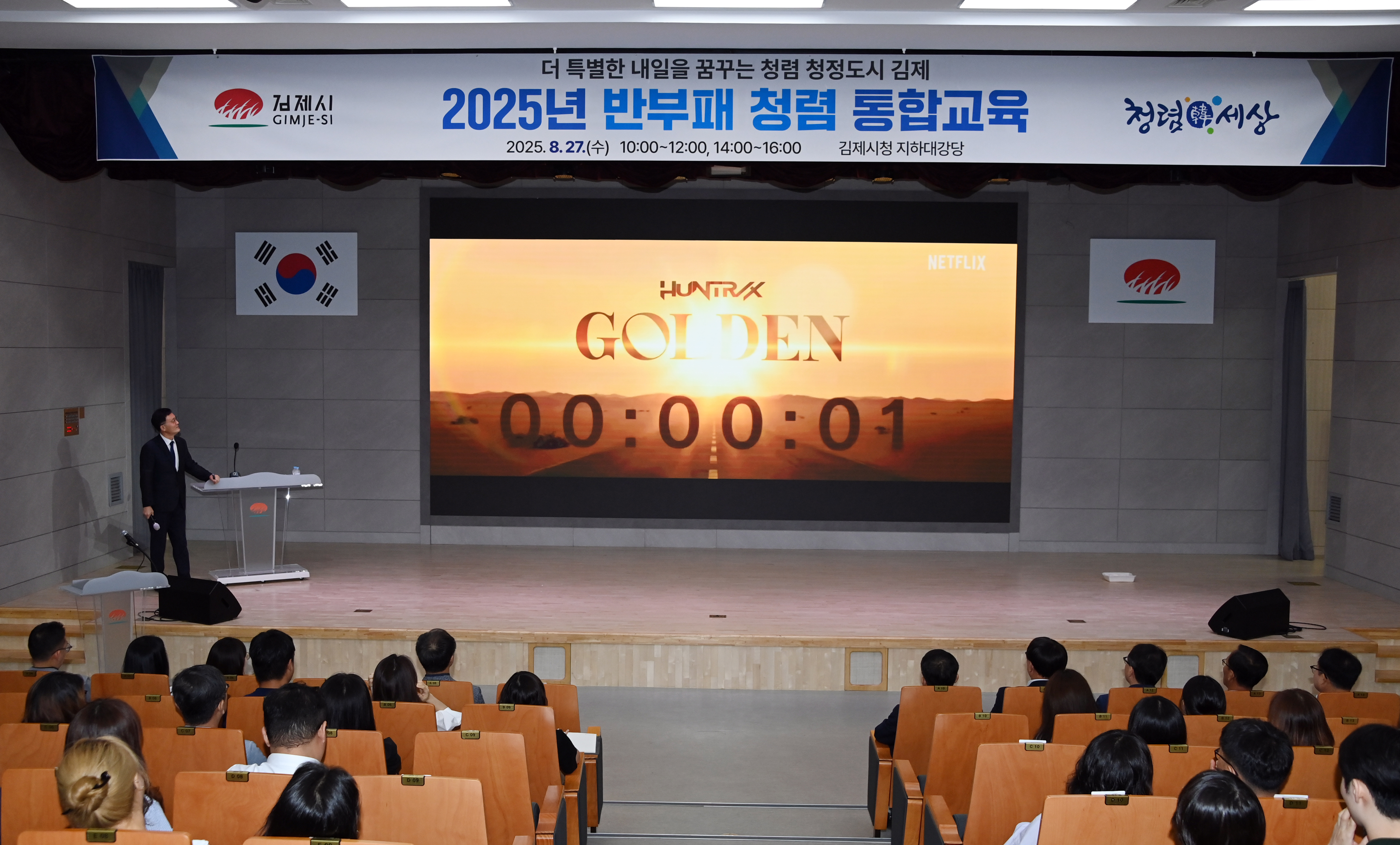 [김제=뉴전북]김제시(시장 정성주)는 27일 시청 대강당에서 정성주 시장과 간부공무원(4급 상당)을 비롯해 신규 임용자·승진자를 포함한 600여 명의 직원을 대상으로 「2025년 반부패·청렴 통합교육」을 오전과 오후 두 차례에 걸쳐 진행했다고 밝혔다.