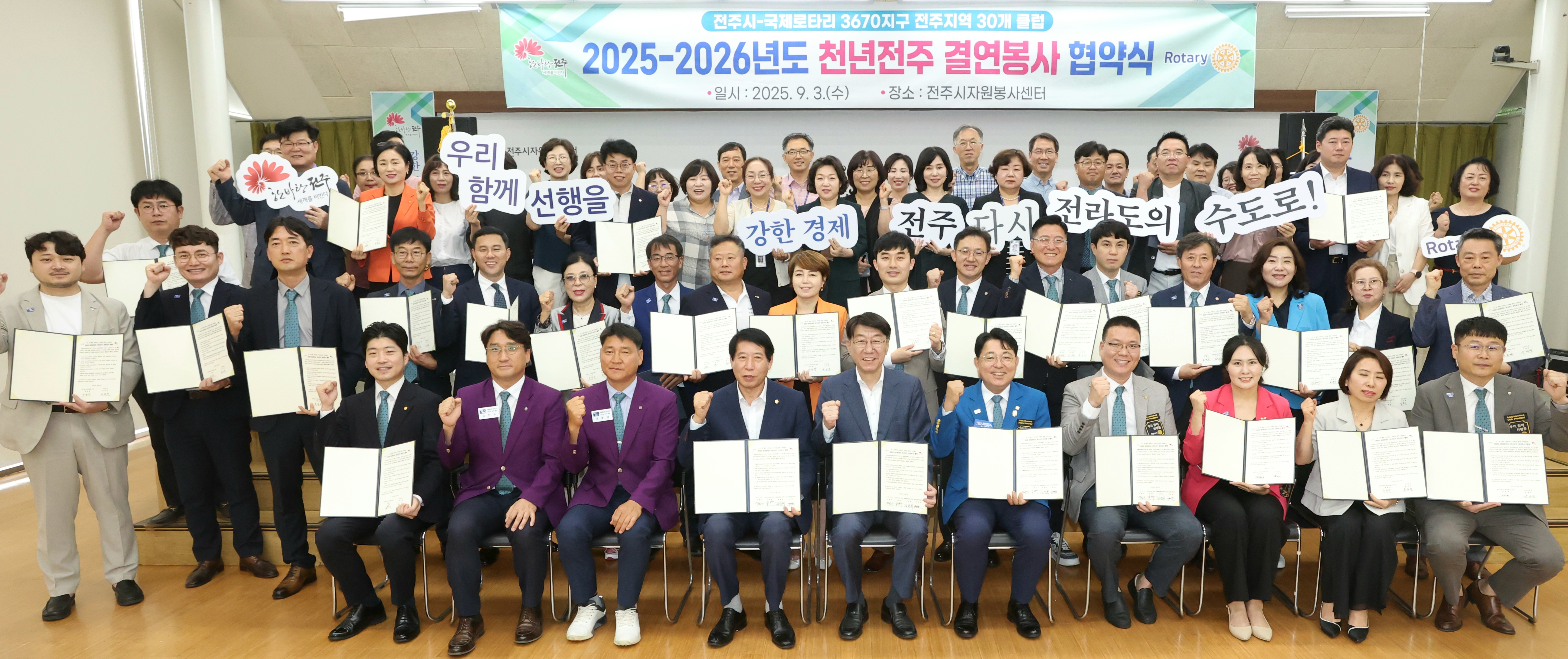 시와 국제로타리 3670지구는 3일 전주시자원봉사센터에서 우범기 전주시장과 남관우 전주시의회 의장, 김성희 국제로타리 3670지구 총재, 박신규 로타리 재전협의회 의장, 전주지역 30개 로타리클럽 관계자, 동 주민센터 관계자 등 80여 명이 참석한 가운데 ‘2025-2026년도 천년전주 결연봉사 협약식’을 가졌다.
