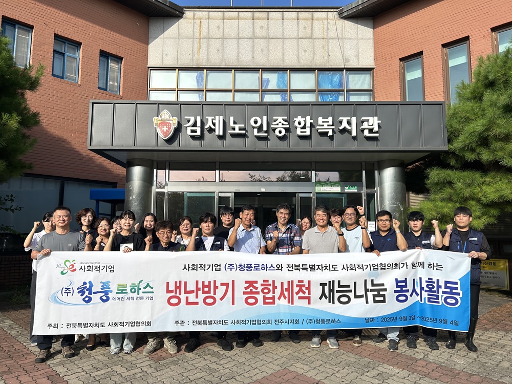 [김제=뉴전북]김제시(시장 정성주)는 김제시노인종합복지관(관장 노기보)이 지난 4일부터 5일까지 이틀간 전북특별자치도 사회적기업협의회 김제시지회와 ()청풍로하스의 후원으로 복지관 내 설치된 냉난방기 50여대에 대한 살균소독 작업을 진행했다고 밝혔다.