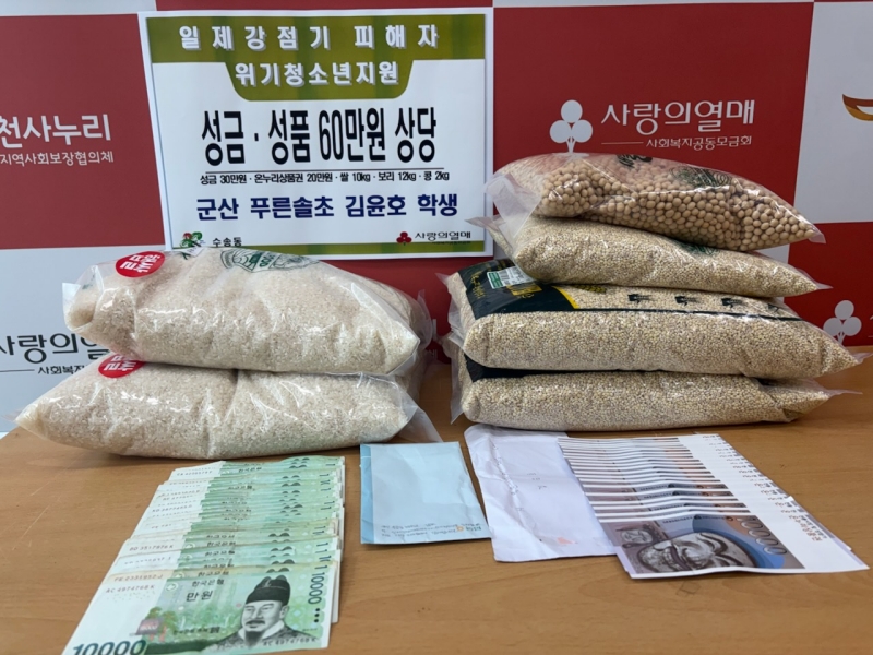 [군산=뉴전북] 군산 푸른솔초등학교 5학년 김윤호 학생이 위기청소년과 일제강점기 피해자 지원을 위해 현금과 쌀·보리·콩을 기부해 귀감이 되고 있다.