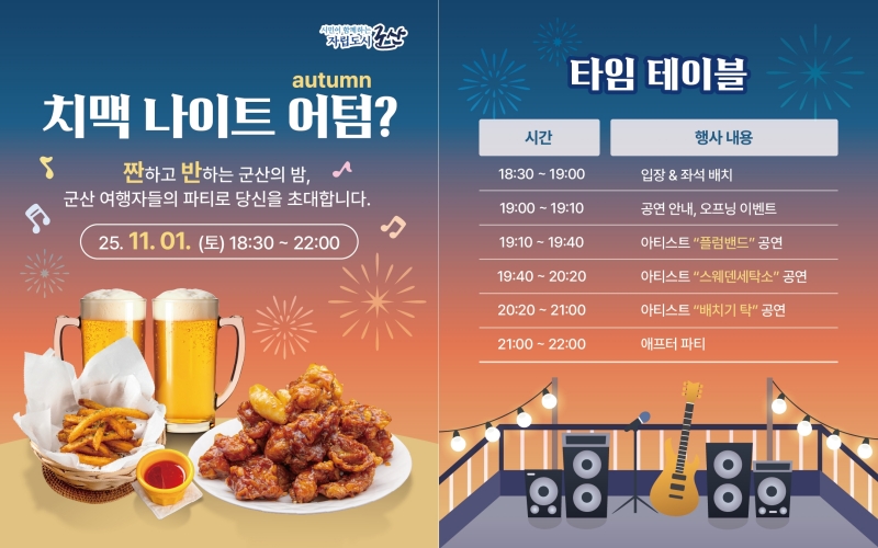 [군산=뉴전북] 깊어가는 가을밤, 탁 트인 야외에서 즐기는 특별한 행사 ‘치맥나이트 어텀(Autumn)?’이 내달 1일 군산시 내항 일원에서 열린다.