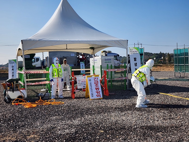 군산시 및 관계기관들도 현장훈련을 통해 의심축 신고에 따른 초동 대응 및 준비사항 점검 의사환축 확인 및 대응 살처분 상황 해제 사후관리 순으로 방역조치 전 과정을 점검했다.