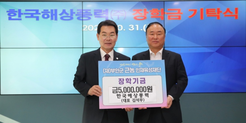 [교육=뉴전북] 한국해상풍력(대표 김석무)이 부안군 근농인재육성재단을 방문해 지역 인재 양성을 위한 장학금 500만원을 전달했다.