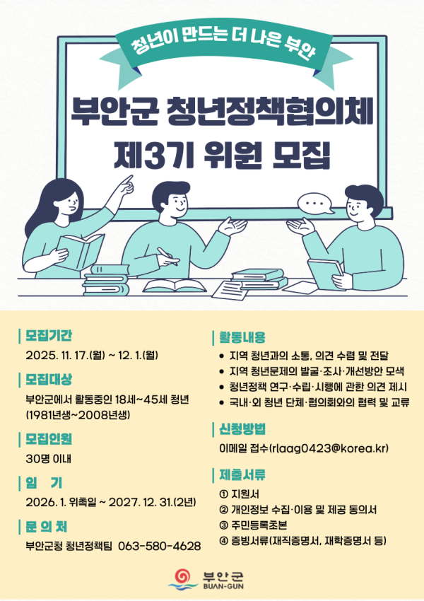 [정치=뉴전북] 부안군은 제3기 부안군 청년정책협의체 위원을 오는 12월 1일까지 공개 모집한다. 정책 수혜자인 청년의 정책 참여를 확대하고 청년의 목소리를 군정 전반에 폭넓게 반영하기 위함이다.