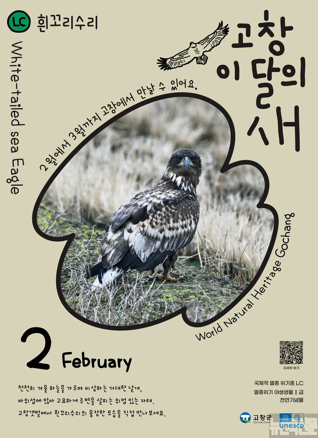 [고창=뉴전북] 고창군이 2월 ‘고창갯벌 이달의 새’로 흰꼬리수리(학명 Haliaeetus albicilla)를 선정하고, 겨울철 고창갯벌을 찾는 맹금류의 생태적 가치와 갯벌 생태계 보전의 중요성을 알리는 캠페인을 전개한다.