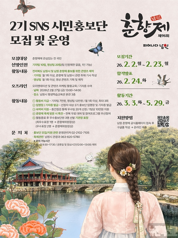 [남원=뉴전북] 남원시(시장 최경식)는 남원시와 춘향제의 다채로운 매력을 생생하게 전할 ‘SNS 시민홍보단’을 모집한다.