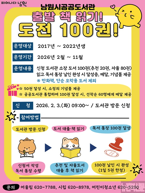 [남원=뉴전북] 남원시공공도서관에서는 어린이들에게 책 읽기의 즐거움과 독서 습관 형성을 위하여 2월부터 11월까지 ‘출발 책 읽기 도전 100권’ 프로그램을 운영한다.