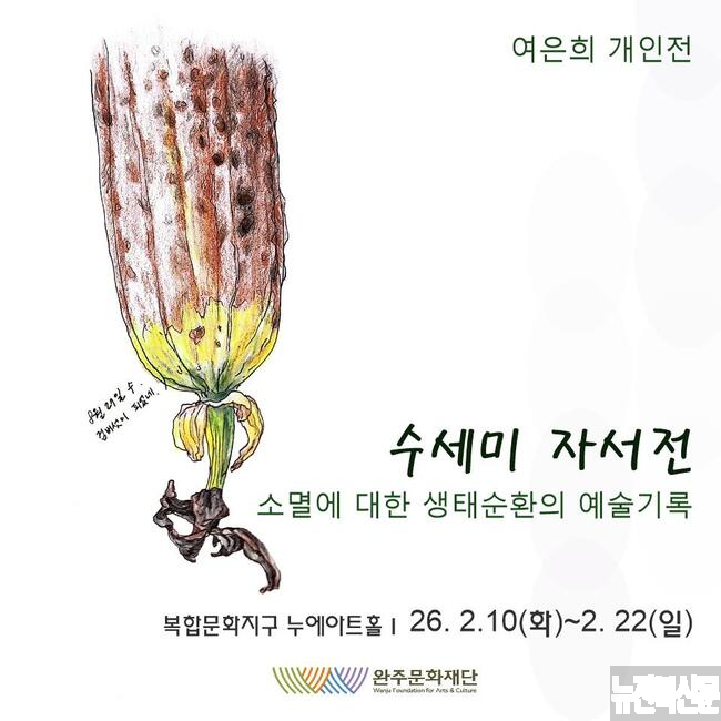[문화=뉴전북] 완주문화재단은 여은희 작가의 개인전 《수세미 자서전 – 소멸에 대한 생태순환의 예술기록》을 2026년 2월 10일부터 2월 22일까지 누에아트홀에서 개최한다.