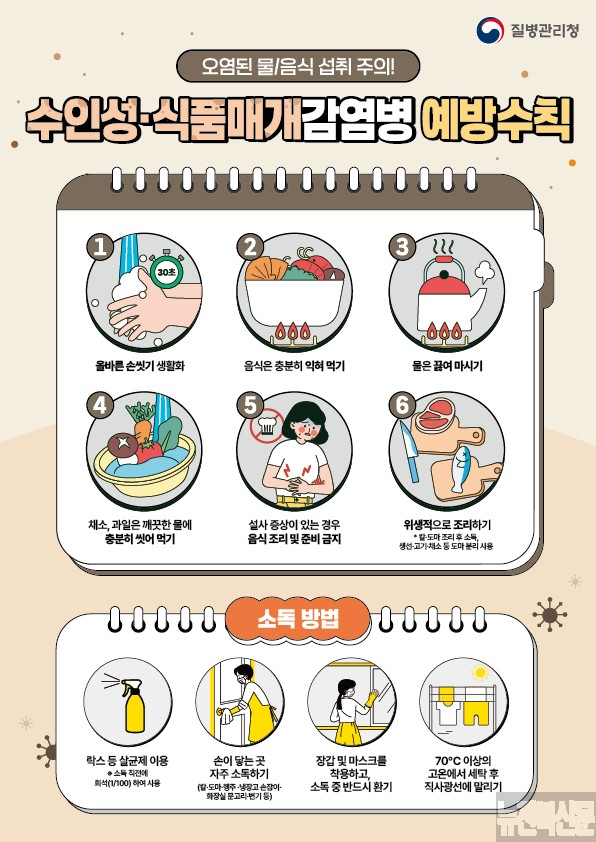 이에 남원시보건소는 감염병 예방을 위해 ▲올바른 손 씻기 6단계 생활화(흐르는 물에 30초 이상 비누로 손 씻기) ▲음식은 충분히 익혀 먹기 ▲물은 끓여 마시기 ▲채소, 과일은 깨끗한 물에 씻거나 껍질 벗겨 먹기 ▲설사 증상이 있는 경우 음식 조리 및 준비하지 않기 ▲위생적으로 조리하기 ▲생선·고기·채소 도마 분리 사용(칼, 도마는 조리 후 소독)을 준수해 줄 것을 당부했다.