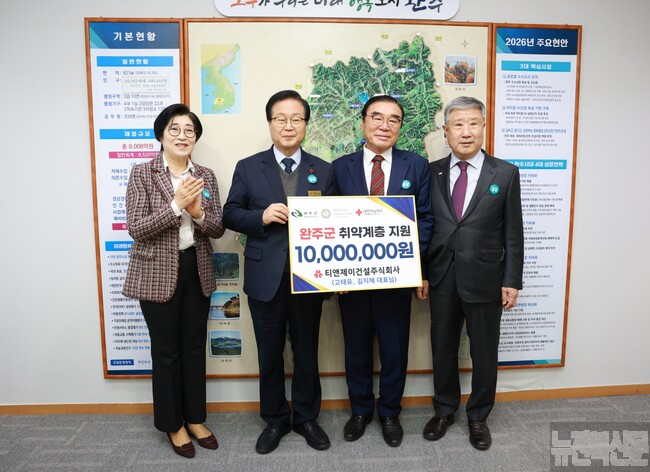 유희태 완주군수는 “나눔으로 지역사회 기여에 앞장서 주신 티엔제이건설에 감사드린다”며 “완주군도 지역 소외계층을 위해 지속적으로 협력해 나가겠다”고 밝혔다.