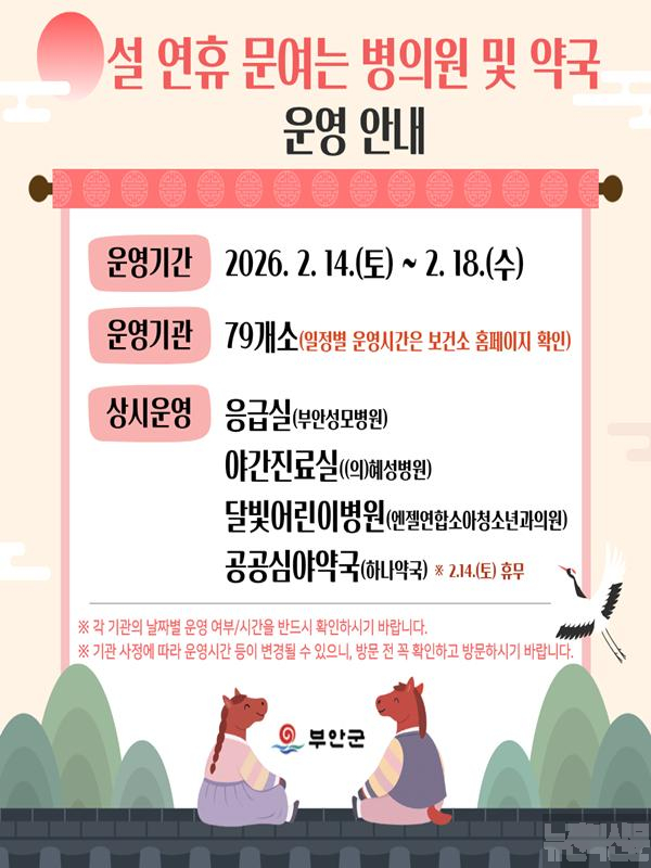 특히 지역응급의료기관인 부안성모병원은 24시간 응급실을 운영할 계획이며, 혜성병원은 야간진료실(09:00~17:00)을, 엔젤연합소아청소년과의원은 달빛어린이병원(10:00~18:00)으로 운영하며, 부안군보건소는 2. 17.(화) 설날 당일에 진료를 실시할 예정이다