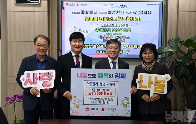 정성주 김제시장은의류를 통해 이웃의 일상에 온기를 전해주신 ㈜엔라인 난닝구닷컴의 뜻깊은 나눔에 감사드린다전해주신 의류는 추운 계절을 보내는 이웃들에게 실질적인 도움이 될 수 있도록 정성껏 전달하겠다고 말했다.