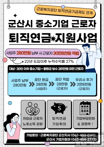 [군산=뉴전북] 군산시가 폐업 등으로 중소기업과 소상공인 근로자들의 노후소득 보장을 위해 ‘퇴직연금 추가 지원사업’을 3월 이후 전국 최초로 시행한다.