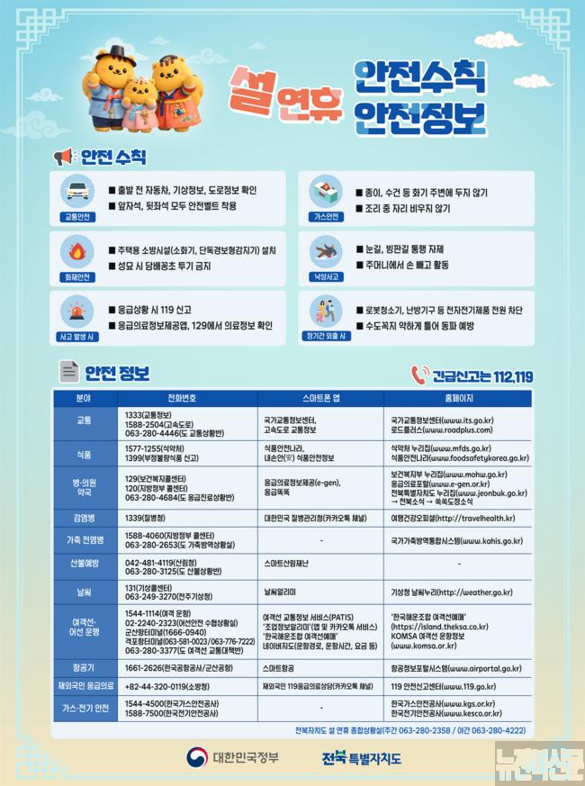 노홍석 전북자치도 행정부지사는 “24시간 빈틈없는 상황관리로 도민 모두가 안심하고 설 명절을 보낼 수 있도록 총력을 다하겠다”며 “일상 속 안전수칙 준수와 안전문화 확산에 도민들의 자발적인 참여를 부탁드린다”고 말했다.