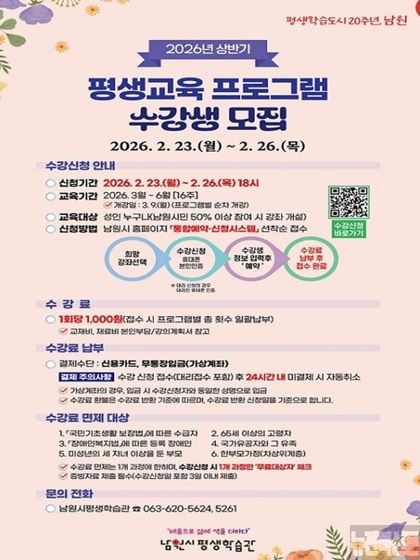 [남원=뉴전북] 남원시가 오는 2월 23일부터 26일까지 4일간, 2026년 평생학습관 상반기 정기교육 프로그램 수강생을 모집한다.