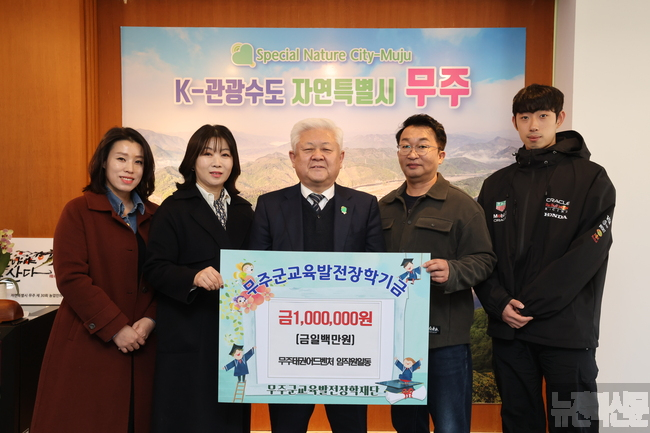 무주태권어드벤처(대표 이도우) 임직원들이 13일 (재)무주군교육발전장학재단에 장학금 100만 원을 전달했다. [사회=뉴전북] 무주태권어드벤처(대표 이도우) 임직원들이 13일 (재)무주군교육발전장학재단에 장학금 100만 원을 전달했다.